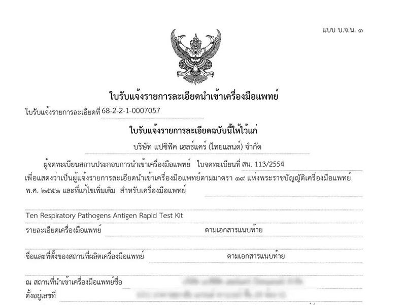 REAGEN Ten Respiratory Pathogens Antigen Rapid Test Kit Thailand Certificate