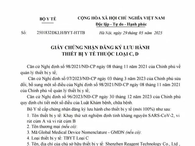 REAGEN COVID-19 & Influenza A/B Antigen Combo Test Kit Vietnam Certificate