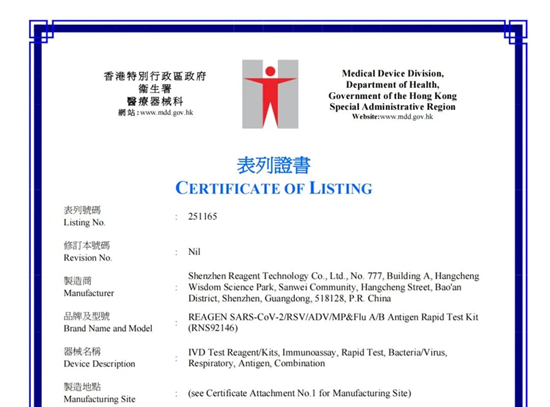 REAGEN SARS-CoV-2/RSV/ADV/HMPV & Flu A/B Antigen Rapid Test Kit Hong Kong Certificate